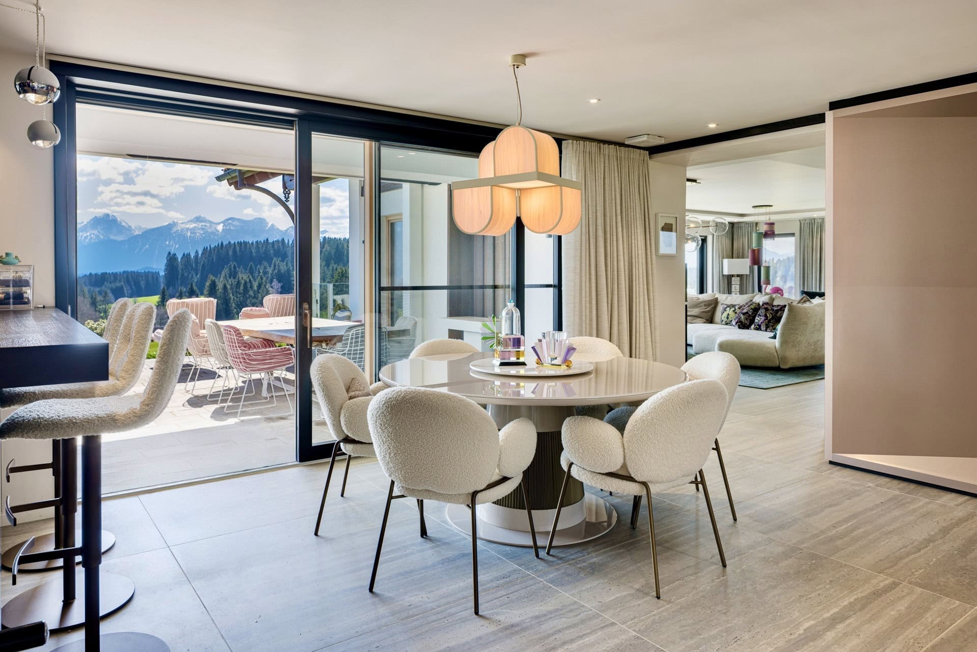 Das Herzstück des Hauses bildet der offen gestaltete Wohn-, Ess- und Kochbereich. Die großzügige Küche von Eggersmann mit Echtholzfronten und einer Natur-Arbeitsplatte in Tauern-Grün und der harmonisch eingebundenen Sitzecke vereint Eleganz und Funktionalität für kulinarischen Genüsse und gute Gespräche in bester Gesellschaft. Durch das offene Raumkonzept bleiben Gastgeber und Gäste stets miteinander verbunden. Vom Essbereich aus gelangt man direkt auf eine überdachte Terrasse, ideal für Grillabende an warmen Tagen oder das Frühstück in der Morgensonne mit traumhaftem Blick.