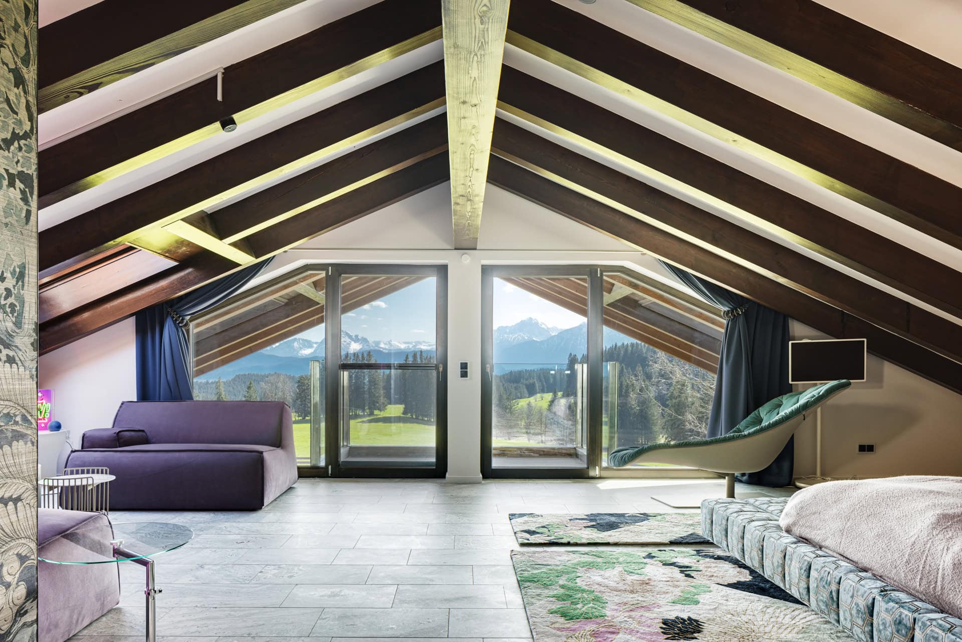 Der private Rückzugsbereich des Hauses beginnt im Obergeschoss, wo sich das großzügige Masterschlafzimmer befindet. Der Schlafzimmerboden aus exklusivem Kolmårdenmarmor in Diamantgefräster-Optik verleiht dem Raum einen Hauch von Luxus, der in Orten wie Schloss Drottningholm und dem Rockefeller Center zu finden ist. Es verfügt über einen separaten Zugang, einen eigenen Balkon und einen unvergleichlichen Blick direkt aus dem Bett auf das Schloss Neuschwanstein und den Forggensee. Zwei separate Ankleidezimmer flankieren das elegante Masterbad, das mit begehbarer Dusche, frei stehender Badewanne und stilvollen Naturmaterialien ausgestattet ist.