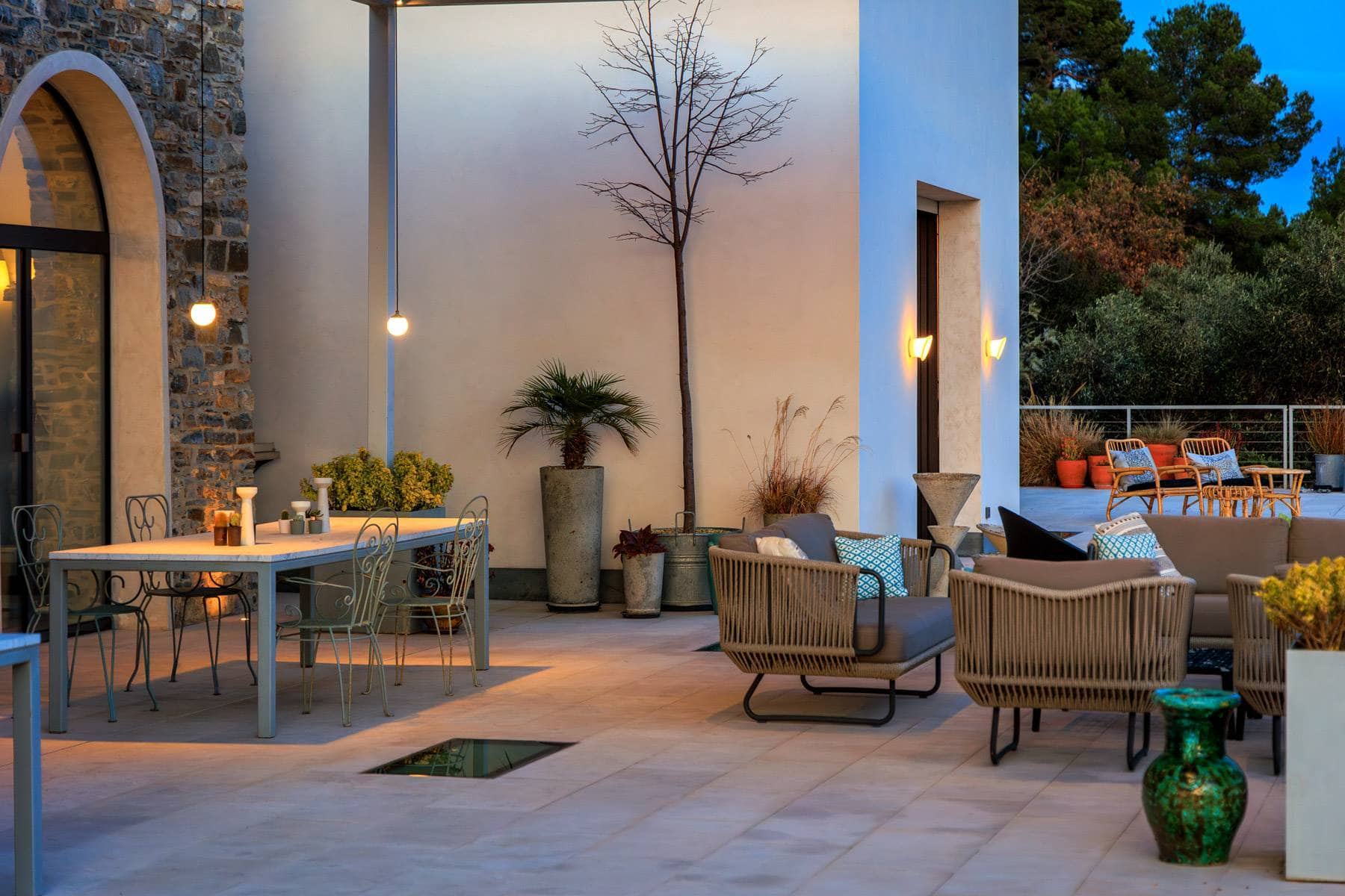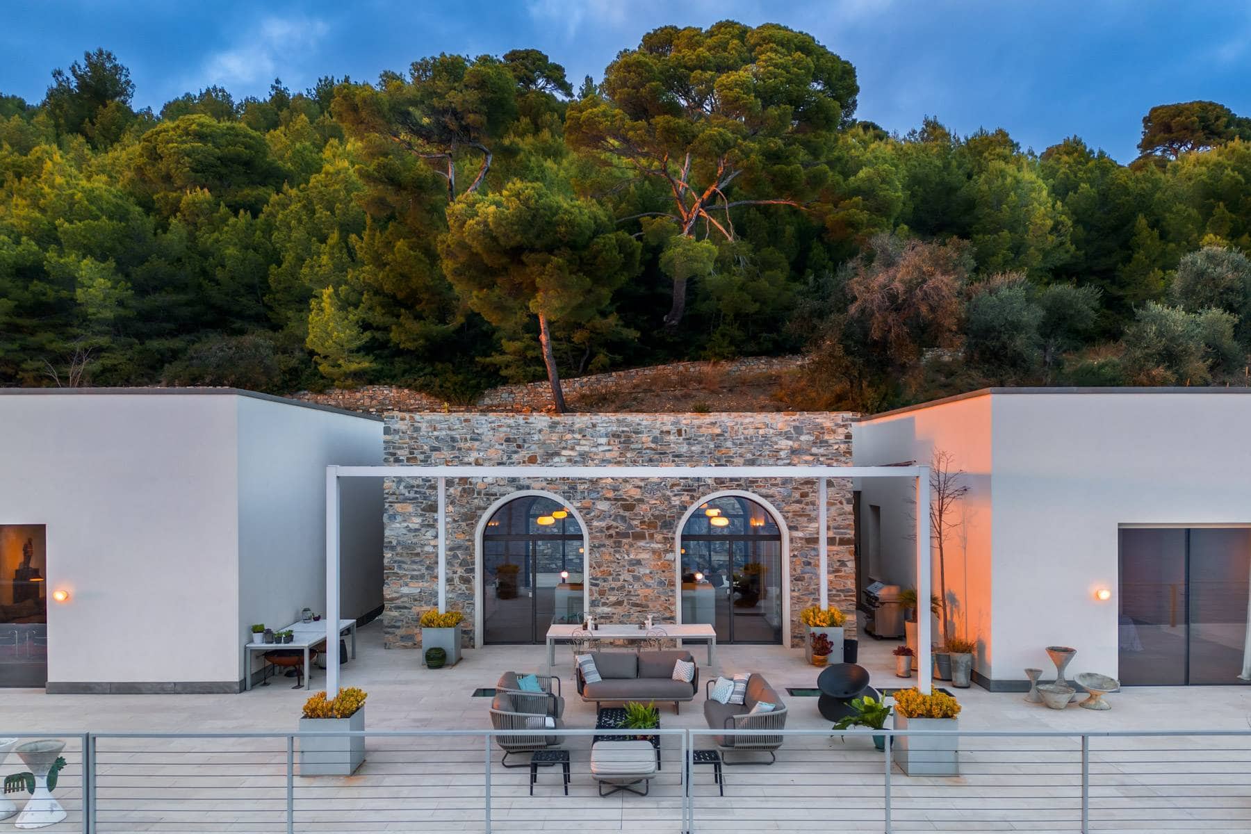 Eingebettet in einen ca. 48.000 m² großen Privatpark mit Oliven- und Zitrusbäumen bietet die Immobilie aus jedem Raum einen atemberaubenden Panoramablick auf das Meer. Auf zwei Ebenen erstrecken sich rund 850 m² Wohnfläche, die sich harmonisch in die umliegende Natur einfügen. Großzügige Fensterflächen durchfluten die Räume mit Tageslicht und unterstreichen das moderne, stilvolle Design. Der weitläufige Wohnbereich mit elegantem Salon und hochwertiger Küche eignet sich ideal für Gäste und gesellige Anlässe. Insgesamt verfügt die Villa über sieben Schlafzimmer – alle mit eigenen Bädern – und bietet so höchsten Wohnkomfort und Privatsphäre.