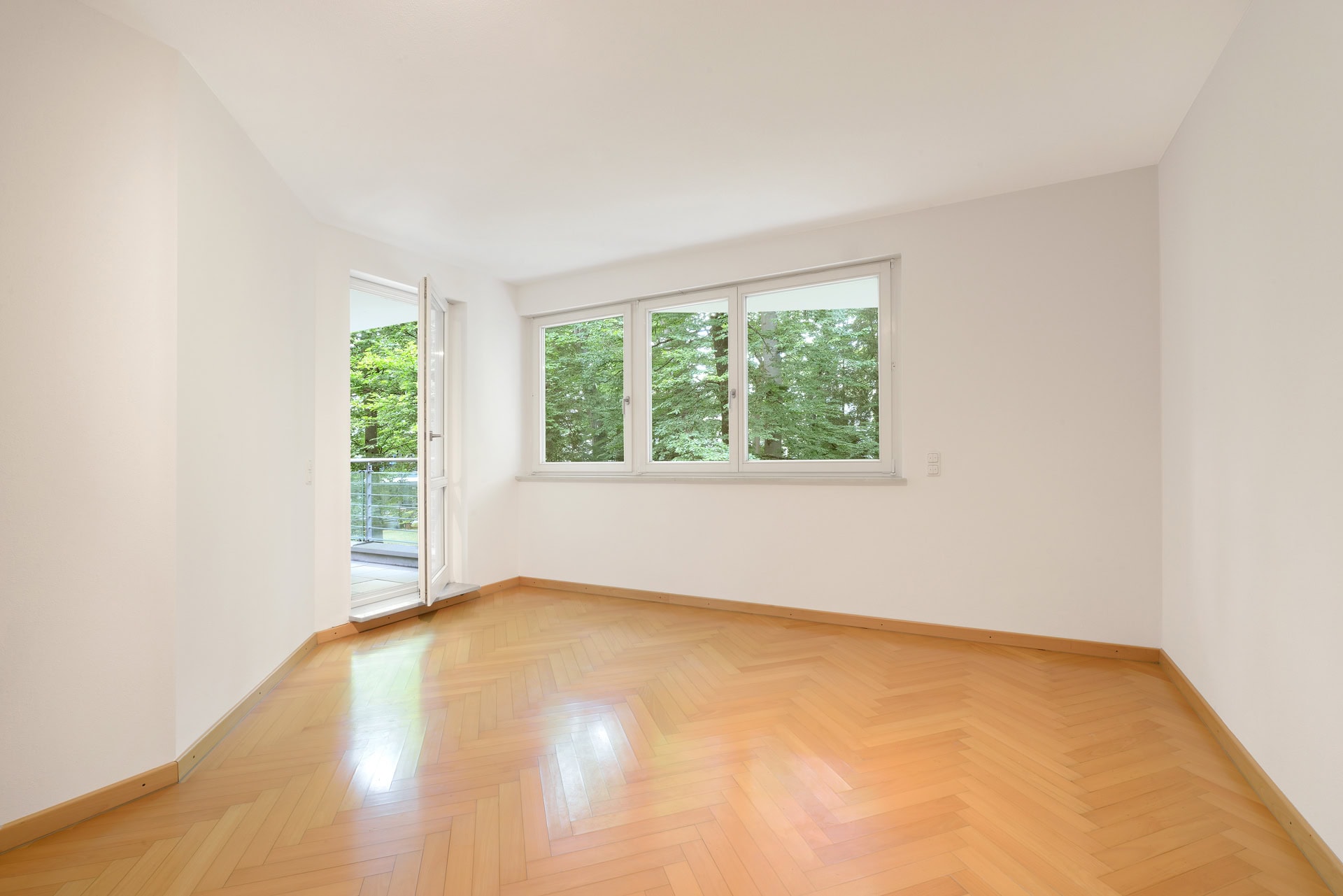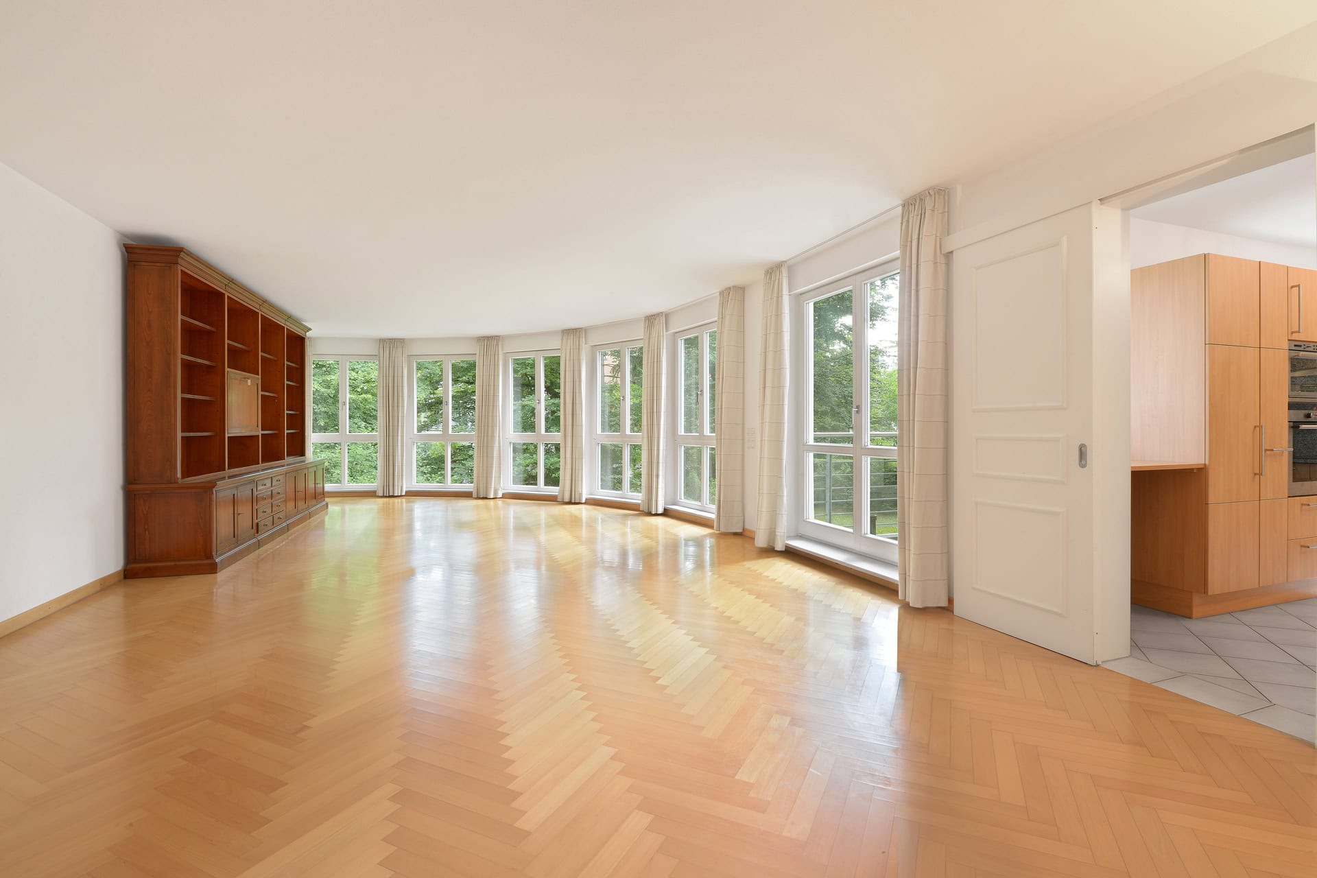 Die großzügig geschnittene Wohnung liegt in einer kleinen, sehr gepflegten Wohnanlage mit nur acht Parteien und bietet damit ein Höchstmaß an Privatsphäre und Ruhe. Ein besonderes Highlight ist der lichtdurchflutete Wohnbereich mit bodentiefen Fenstern, die einen wunderschönen Blick ins Grüne eröffnen. Die überdachte Südwestterrasse (ca. 21,8 m²) sowie ein zusätzlicher, überdachter Nordbalkon (ca. 6,6 m²) laden zum Verweilen im Freien ein. Der weitläufige Garten steht allen Bewohnern zur Mitbenutzung zur Verfügung und vermittelt das Gefühl, mitten in einem Park zu wohnen. Die Wohnung befindet sich zudem direkt an einem rund 6.000 m² großen, parkähnlichen Grundstück mit altem Baubestand – ein echtes Alleinstellungsmerkmal.