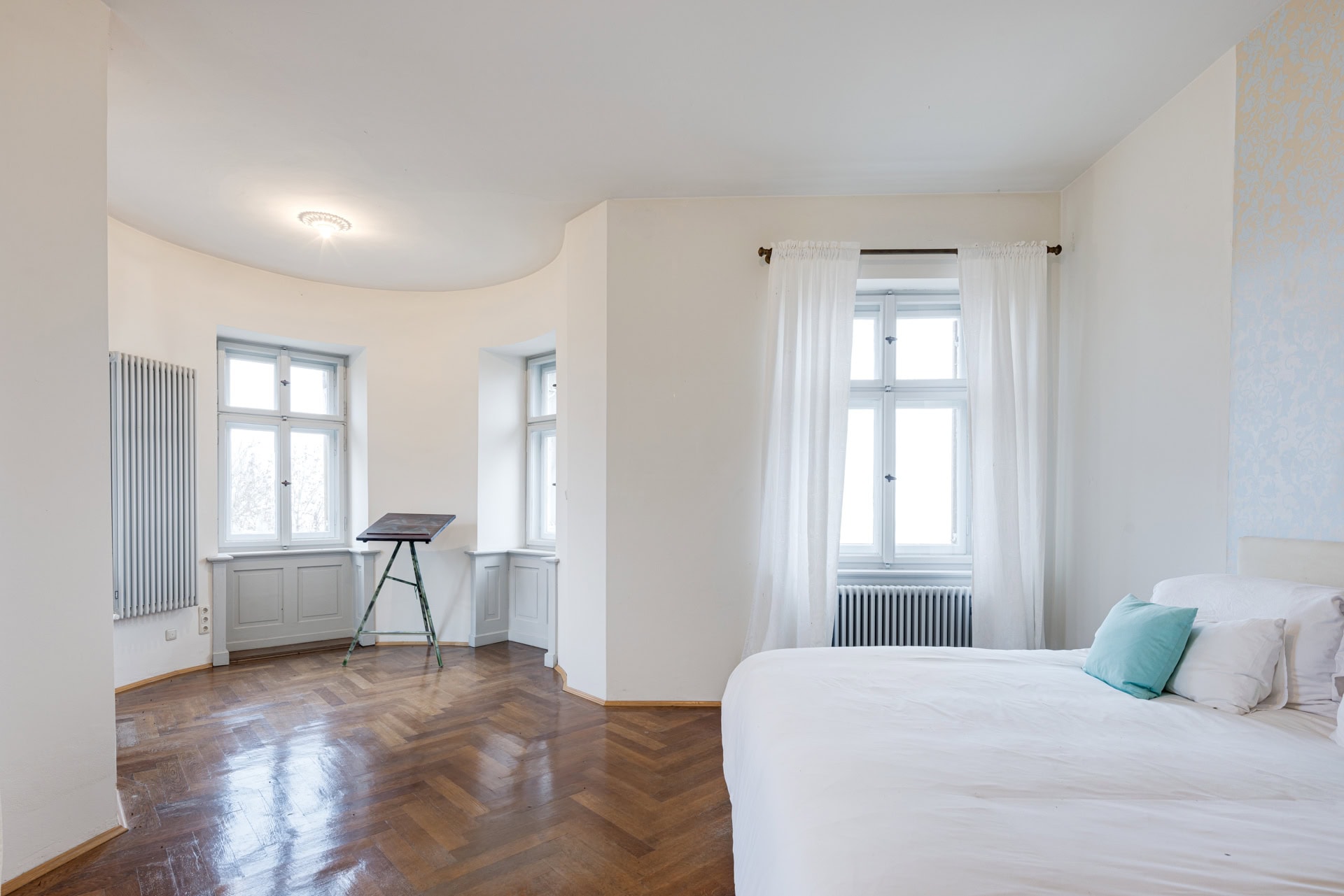 Das Schloss verfügt über 34 Zimmer mit hohen Decken, teilweise Erkern, Gewölbedecken, originalen Holzfußböden und historischen Details.