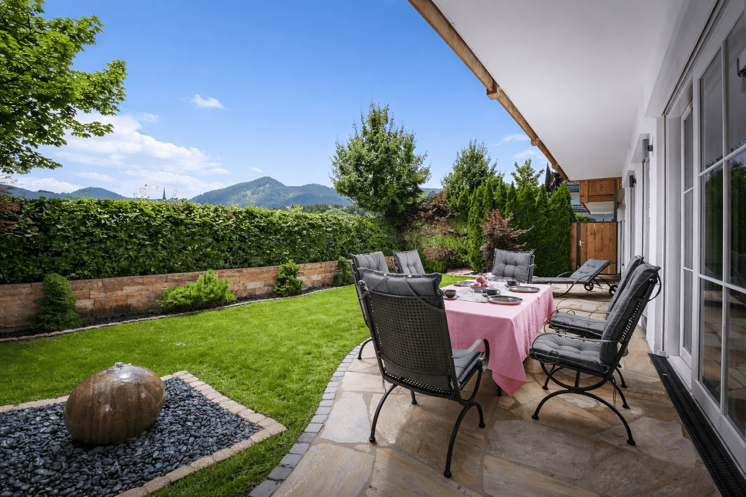 Der offen gestaltete Wohn- und Essbereich bildet das Herzstück der Immobilie und öffnet sich harmonisch zum liebevoll angelegten Garten mit umlaufender Terrasse – ideal für entspannte Stunden im Freien. Zwei komfortable Schlafzimmer, zwei stilvoll ausgestattete Badezimmer (davon eines en Suite), sowie eine separate Gästetoilette bieten ausreichend Platz für Familie und Gäste.