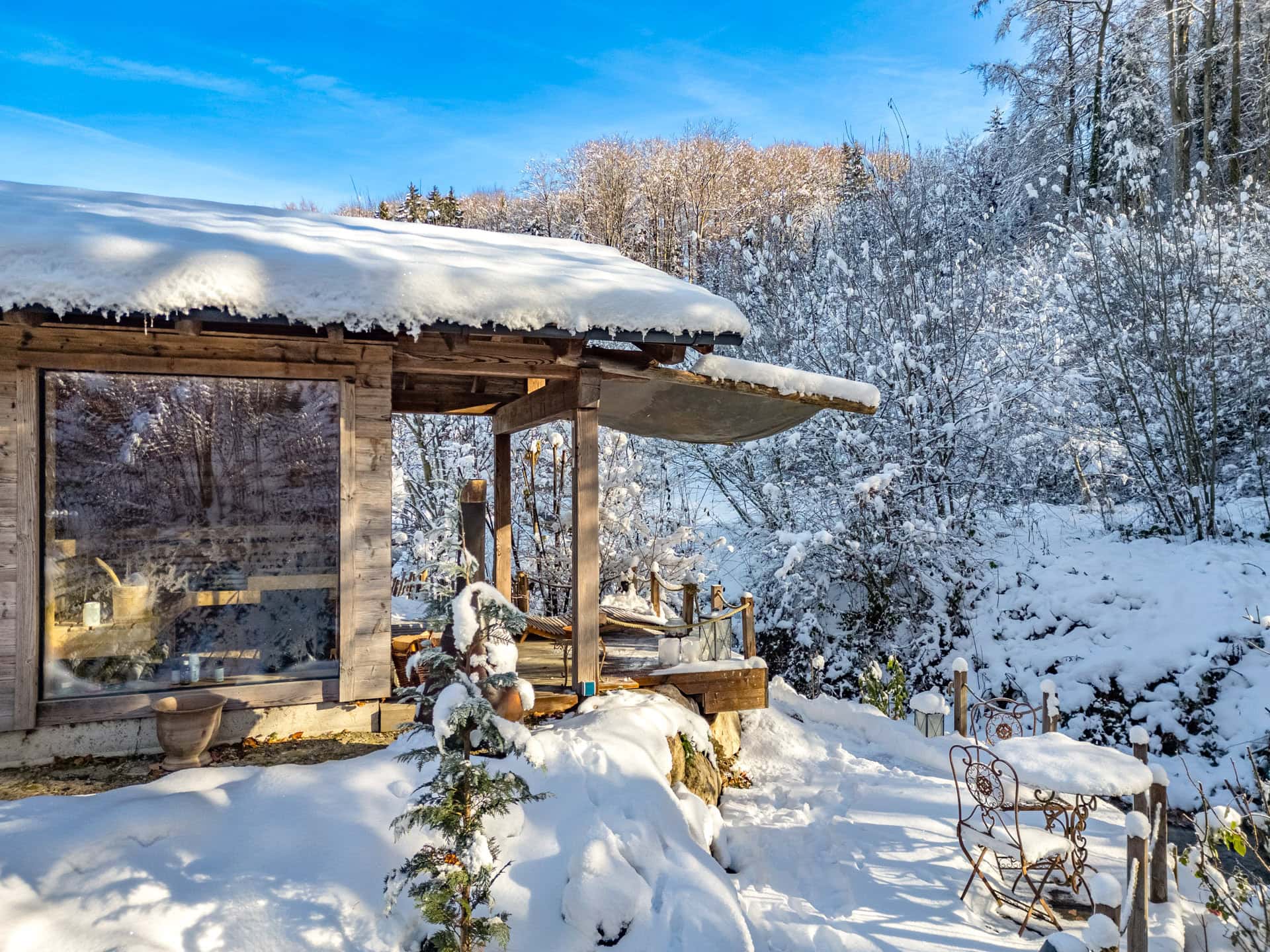 Das Saunahaus mit Terrasse bietet Entspannung mit Blick auf den Bach und das beruhigende Plätschern begleitet selbst den Schlafbereich.