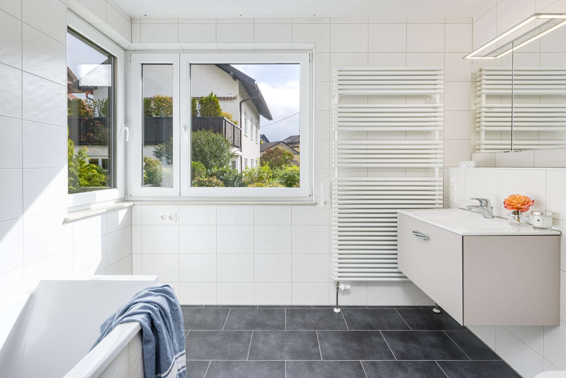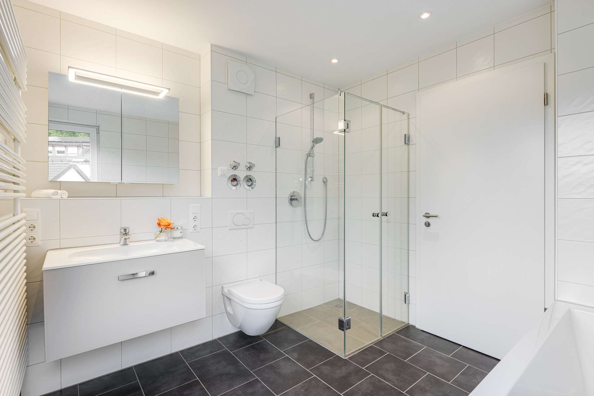 - Modernes Bad mit Walk-In Dusche, Badewanne, WC, Waschtisch und Handtuchheizung sowie Waschmaschinenanschluss