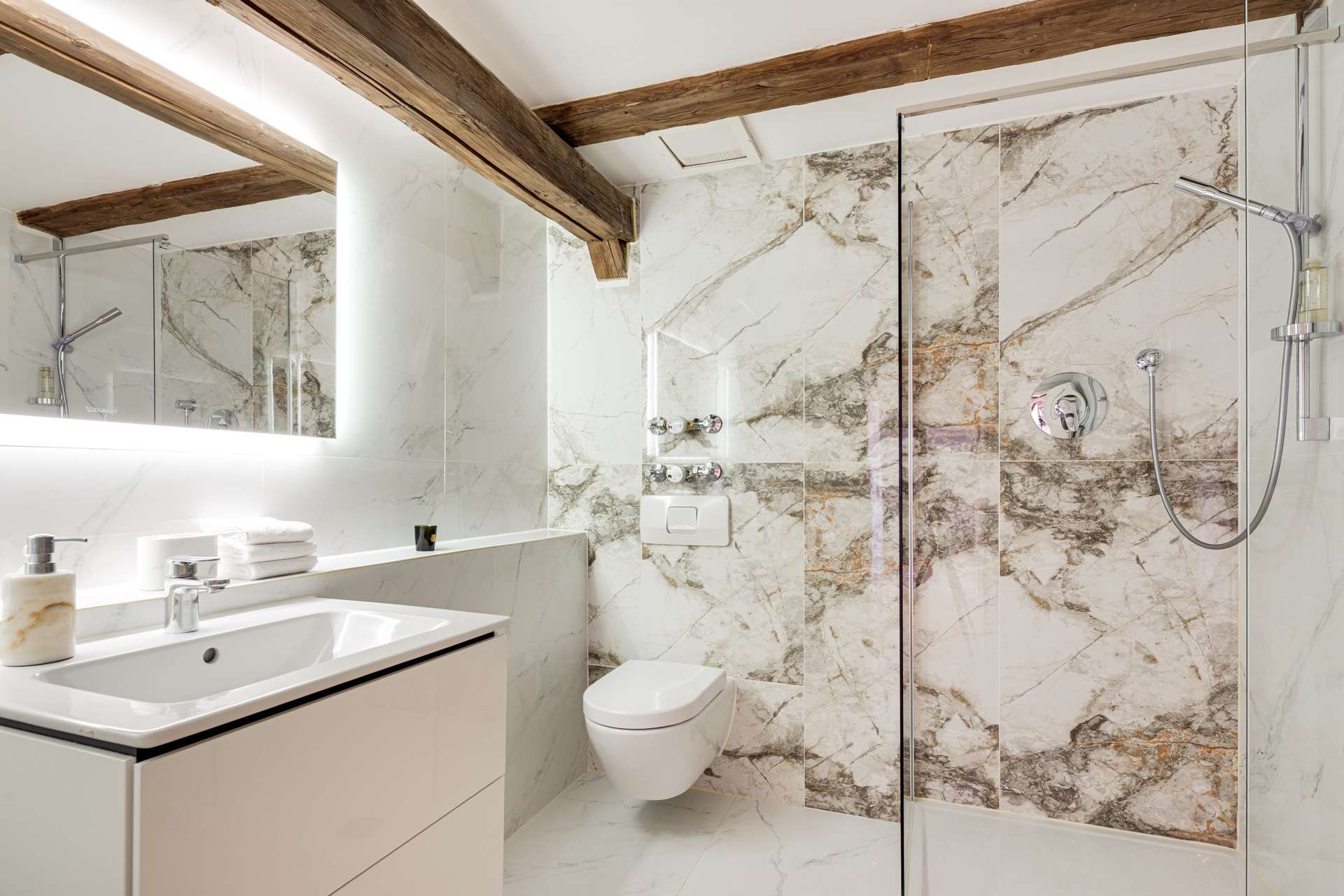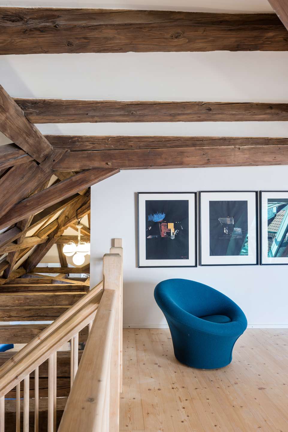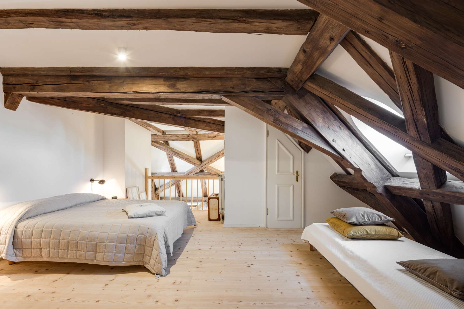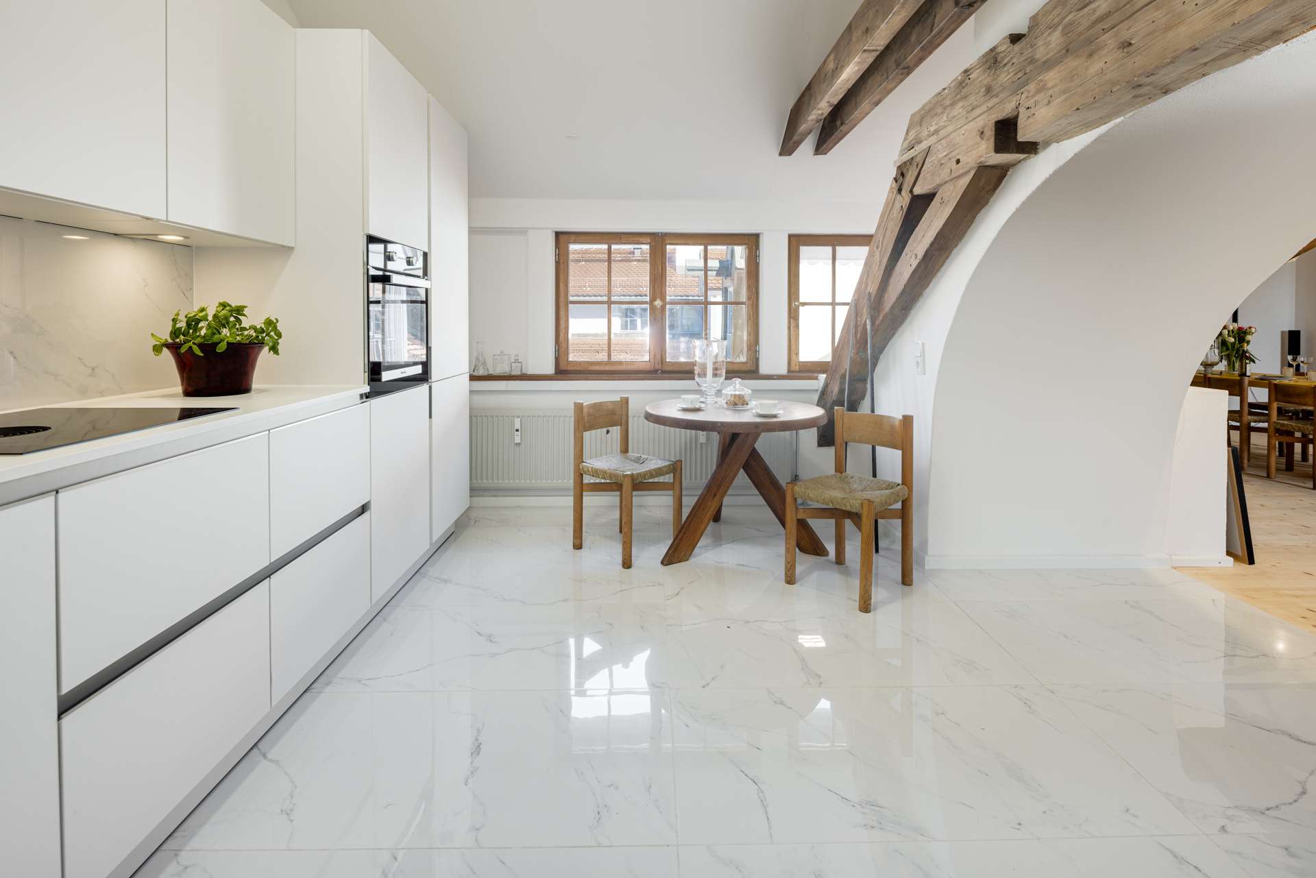 Die im Dachgeschoss gelegene Maisonette-Wohnung besticht durch ihren offenen Grundriss, den beeindruckenden Original-Dachstuhl aus dem Jahr 1726 und ein großzügiges Raumgefühl mit Loft-Charakter. Auf der unteren Ebene befindet sich der helle Wohn- und Essbereich mit offener Küche sowie ein weiteres Zimmer, ideal als Arbeits-, Gäste- oder Kinderzimmer. Auf der Galerieebene erwarten Sie das Schlafzimmer mit Bad en suite sowie ein weiteres Badezimmer.